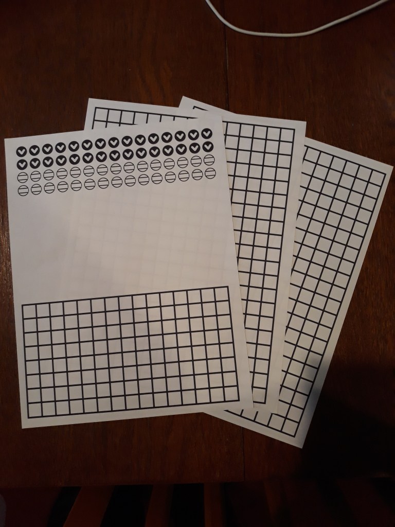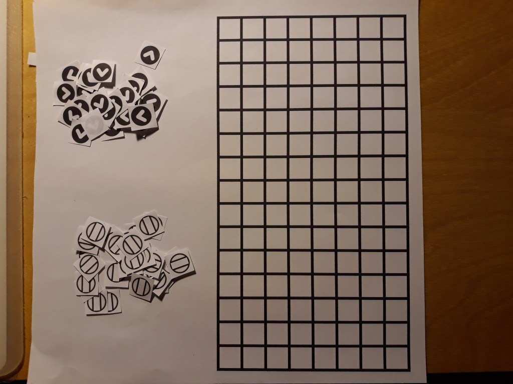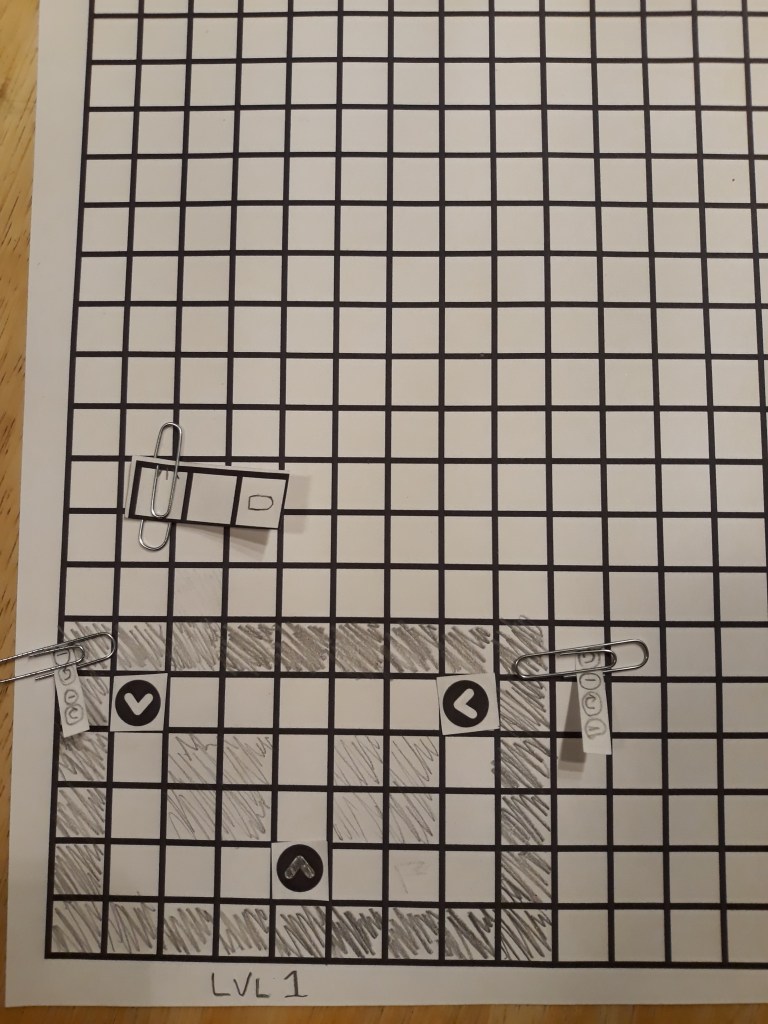 I then created a couple of game levels, using small slips of paper and paperclips to show the programming of the enemies and what the stage the programming or gun pattern was on. I tested the game with both myself and multiple family members. However, I quickly realized that the pool of volunteers to help me test my prototype was quickly thinning out, since, with this testing taking place during the coronavirus pandemic, I was restricted to testing the game with only the people in my household.