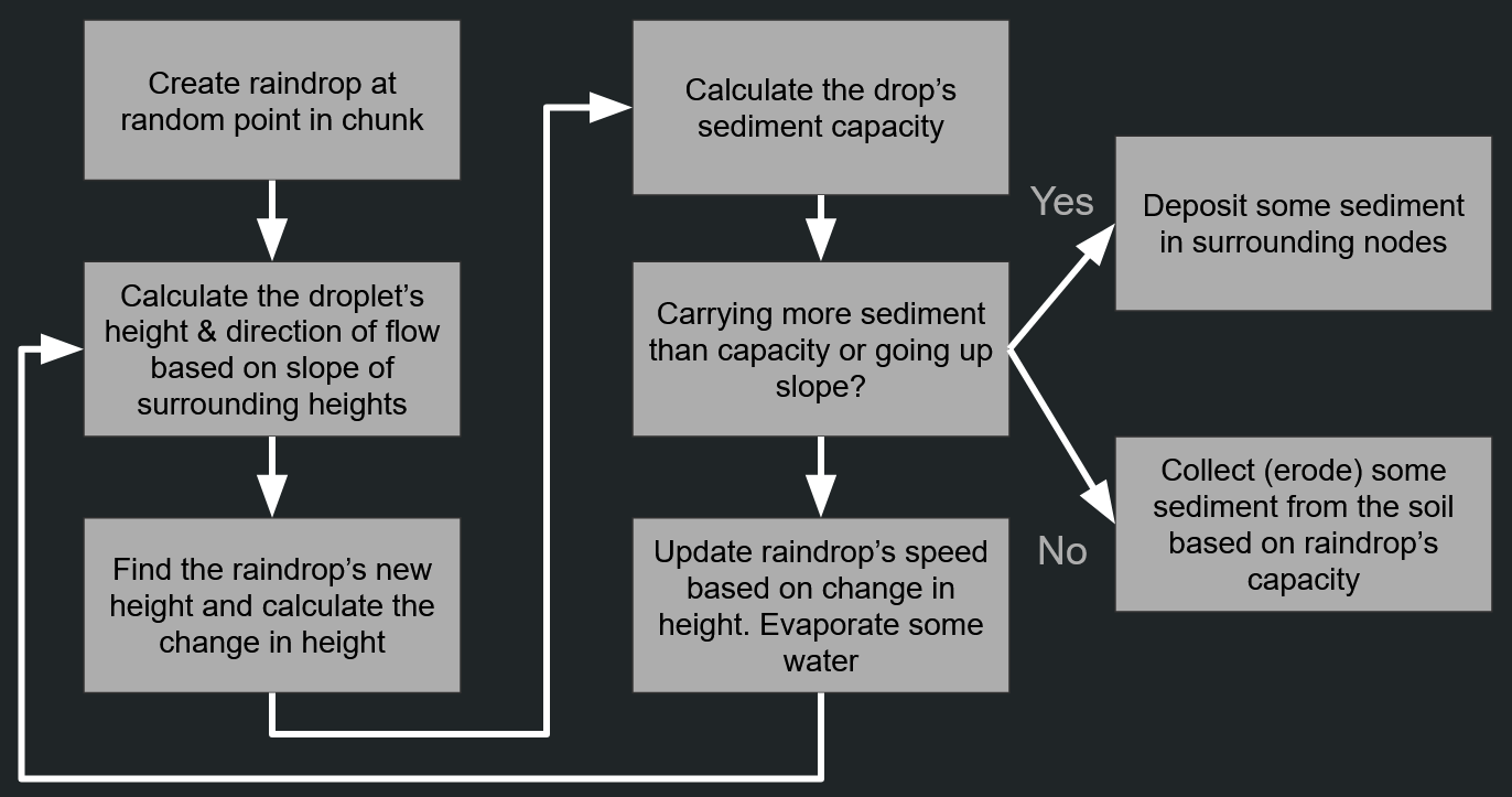 My erosion simulation performs the following process thousands of times over a chunk of terrain to simulate the effects of long-term rainfall: