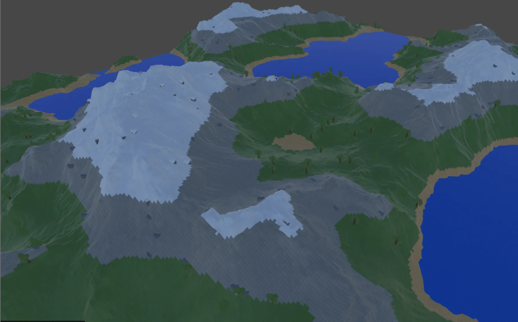 My terrain generator uses Perlin noise as a foundation, and combines it with fractal Brownian motion to allow for the adjustment of multiple layers of noise at different scales. By default, the terrain created by my terrain generator will often look like this: