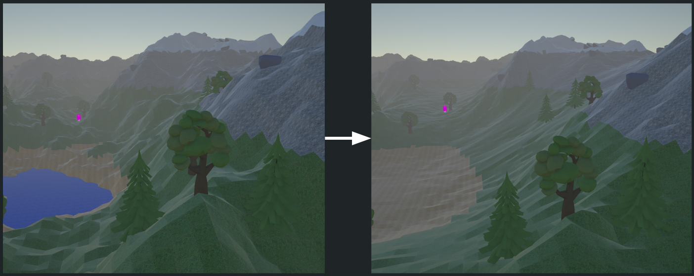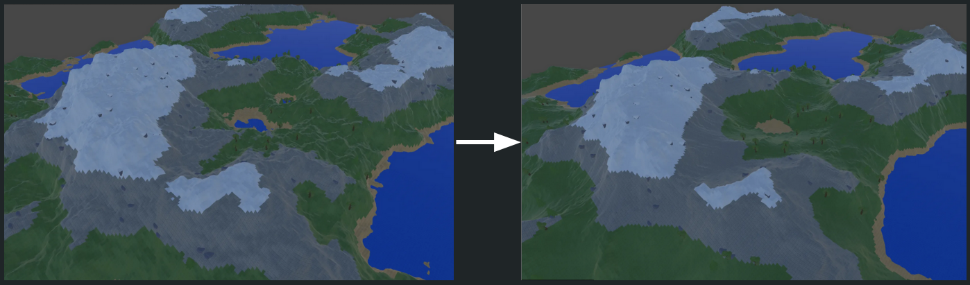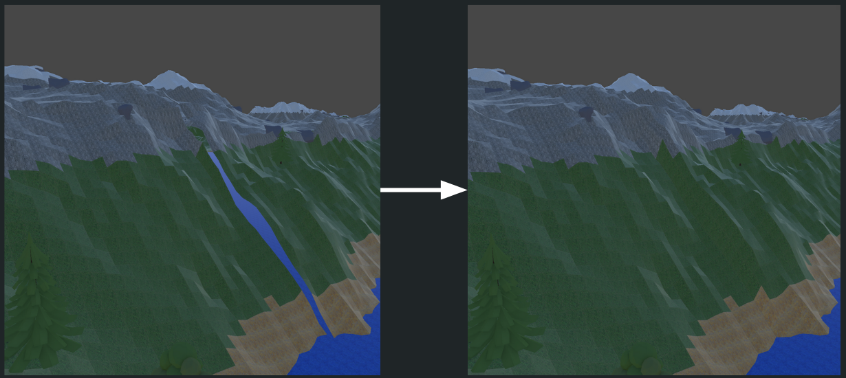 To avoid creating seams between different chunks of terrain, I performed a simple process where the sides of each chunk would re-stitch themselves at a point in the middle of the elevation of each side.